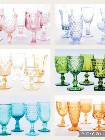 The colored glassware is available in collections that very in design and pattern. Depending on the color and how many you need, your select will depend on how many we have in stock.